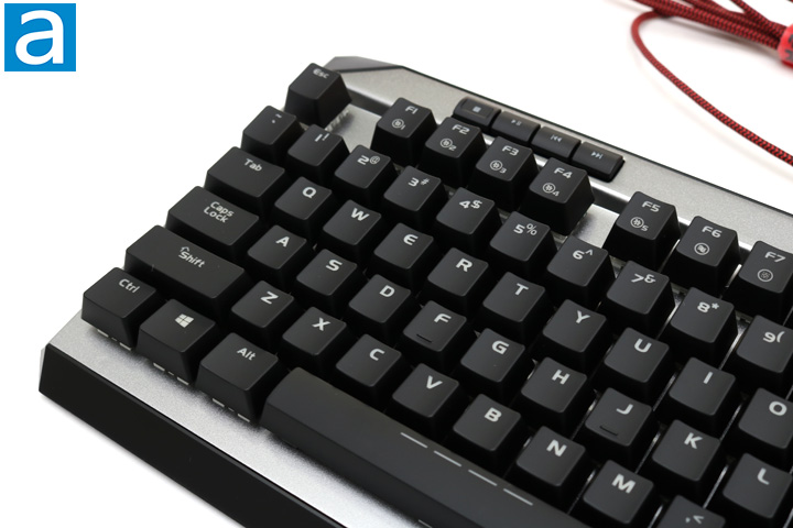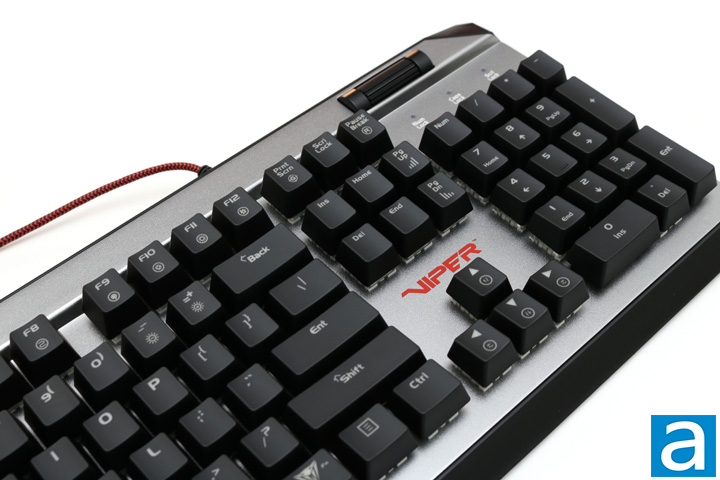 The Patriot Viper V765 is a rather large keyboard with the dedicated media controls found along the top. The sides also slope outward slightly extending the width by a few millimeters. The exposed aluminum backplate looks great with its silver color and instantly exudes a feel of quality. According to the manufacturer’s website, the aluminum is aircraft grade, which means this keyboard should last for years and years. With the aluminum exposed, it is easy to see the bottom of the switches. One thing I appreciate about being able to see the switches is the RGB LEDs leak light, creating a sort of underglow on the keyboard. The LEDs are, in my experience, more vivid when the light can escape downward as well as through the etching on the key. Even though the aluminum forms a strong backbone of the keyboard, it still has a plastic shell housing the rest of the components. Furthermore, the Viper V765 does not only have RGB LEDs under the keys, but also on the sides of the keyboard. There is a short LED bar on each end of the keyboard, which steps up the RGB game.