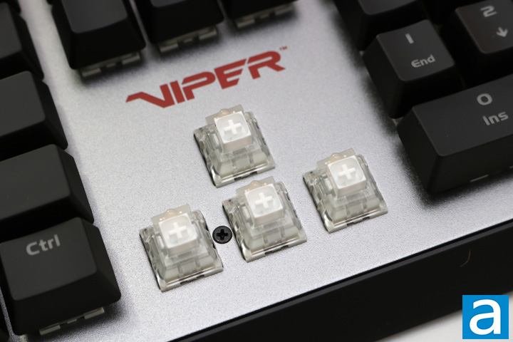 Patriot has ensured the Viper V765 has NKRO, which is N-key rollover. This means that no matter how many keys are pressed independently, each individual key will be recognized. NKRO is a must for gaming keyboards, as there are plenty of occasions where you need to press multiple keys and having each key registered is crucial. Under the keycaps of the Patriot Viper V765, we find Kailh Box White switches. These are mechanical switches, which are the most popular type of switches for gaming today. There are many different types from different manufacturers all classified under different colors to indicate their unique characteristics. These Kailh Box White switches are similar to Cherry MX Blue switches. The Kailh Box White switches are noisy and clicky with a total travel distance of 3.6 mm. Its actuation force is 50g, and its actuation point is at 1.8 mm. As for the box, it is intended to indicate these switches are protected a bit better. In addition to physically stabilizing the keycap slightly, Kailh Box switches are rated IP56 for dust and water resistance. However, these also are only compatible with SMD LEDs in order to keep this resistance rating.