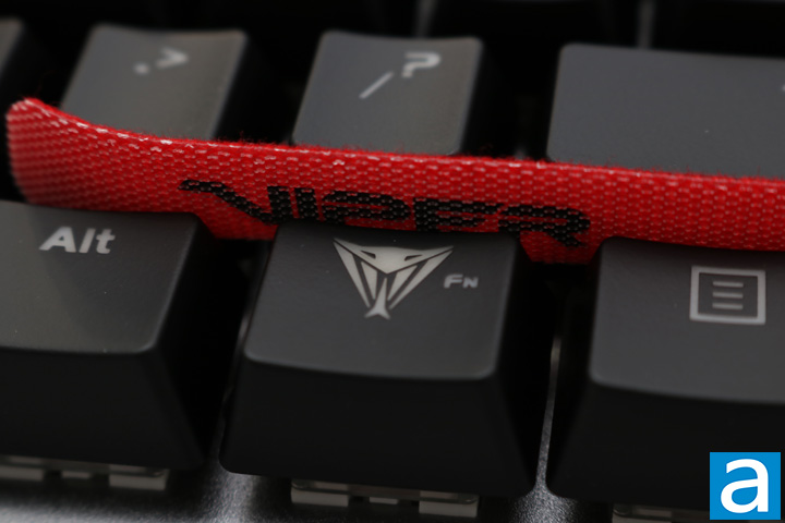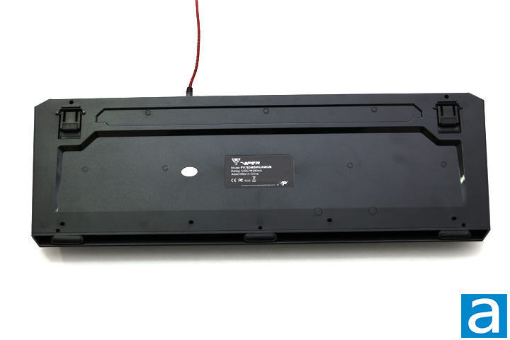 The back of the Patriot Viper V765 looks about the same as any other keyboard. Right in the center is a sticker with some miscellaneous information, while there are rubber feet found at every corner and in the bottom middle. The rubber feet along the bottom are large and thick, ensuring the keyboard will stay in place on the table. The small stands also feature some rubber to keep everything in place. The wrist rest also has three more rubber feet along it to keep everything in place. A braided 1.8 m long cable is located off center along the top. It has some extra rubber where it connects to the keyboard to ensure the cable does not easily detach from the keyboard.