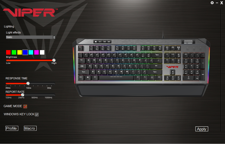 The software is extremely simple and straightforward. There is mainly just the page you see in the image above. It allows one to change the lighting modes and the LED colors. Unfortunately, it only gives you eight different colors to choose from. One would hope in an RGB keyboard to actually be able to access the 16.8 million colors. The brightness and speed of the lighting effects can be changed on this screen, including the response time and report rate. Game mode can also be activated or deactivated. The profile button allows one to save profiles to the computer and load any previously saved profiles onto the keyboard. The macro button is to record and program different macros. After recording a macro, you can select a key on the keyboard in the software to program either the macro to the key or some other basic settings that Patriot have deemed important enough. This ranges from maximizing or minimizing a window to even multimedia keys. I also encountered no bugs or issues with the program throughout use. All in all, the software looks basic but is definitely intuitive and a pleasant experience to use.
