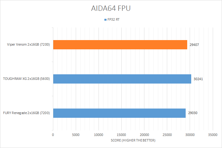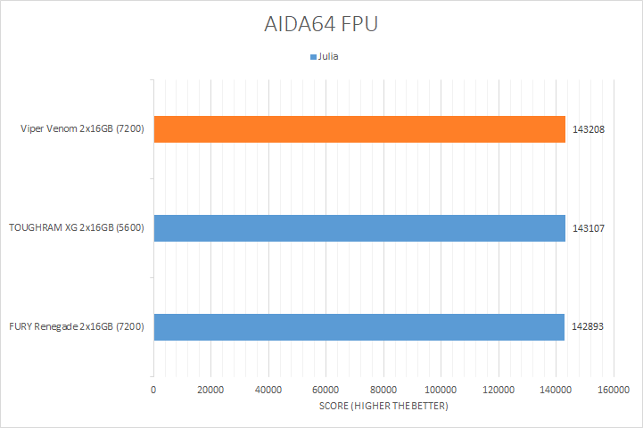 Usually, AIDA64's FPU benchmarks are the least exciting of all when writing a RAM review. This is because the way results are obtained is usually highly dependent on the tested processor, so much to an extent that the outcome is typically irrelevant to the speed or latencies of the installed memory modules. As you can see in our graphs above, all the results were within a few percent of each other. There were three results where the difference was more noticeable, which were the Mandel, FP32 RT, and FP64 RT tests. The highest bandwidth Viper Venom and FURY Renegade were measurably slower than the Thermaltake TOUGHRAM XG RGB D5 DDR5-5600 2x16GB, which was surprising. At the end of the day, they were almost all reasonably within the same ballpark as each other.