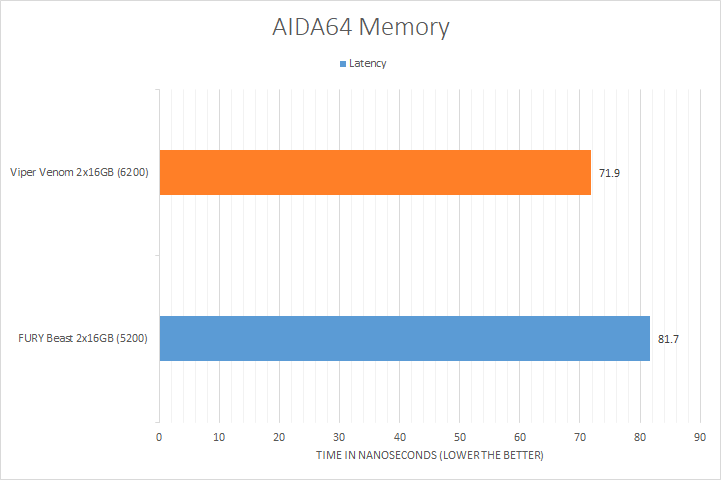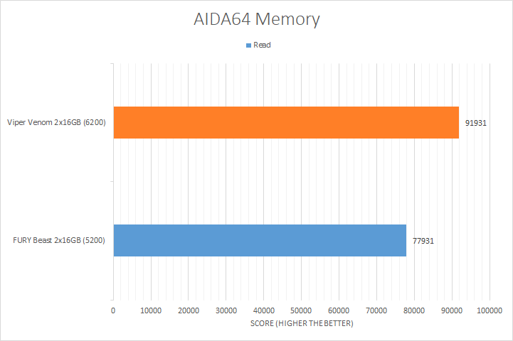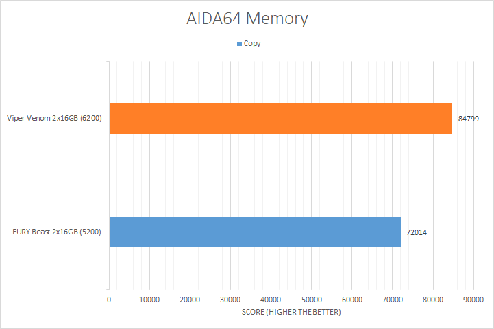AIDA64's synthetic memory tests are the one next up to produce results for our review today. Traditionally, in pretty much all the benchmarks, see higher memory bandwidth RAM kits are generally favored, whether it is the Copy, Write, or Read results. Operating at DDR5-6200, the Patriot Viper Venom RGB completely dominated the Kingston FURY Beast DDR5-5200 2x16GB, which is not surprising given its rated bandwidth.