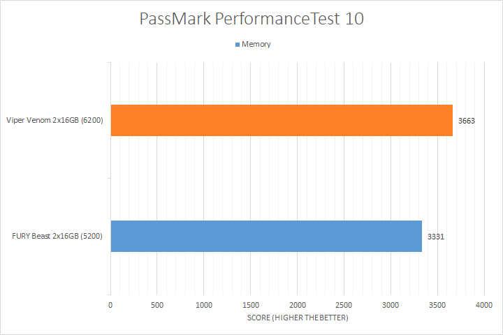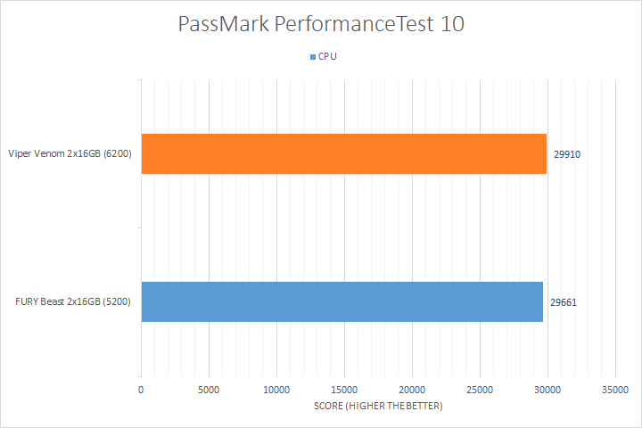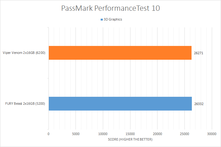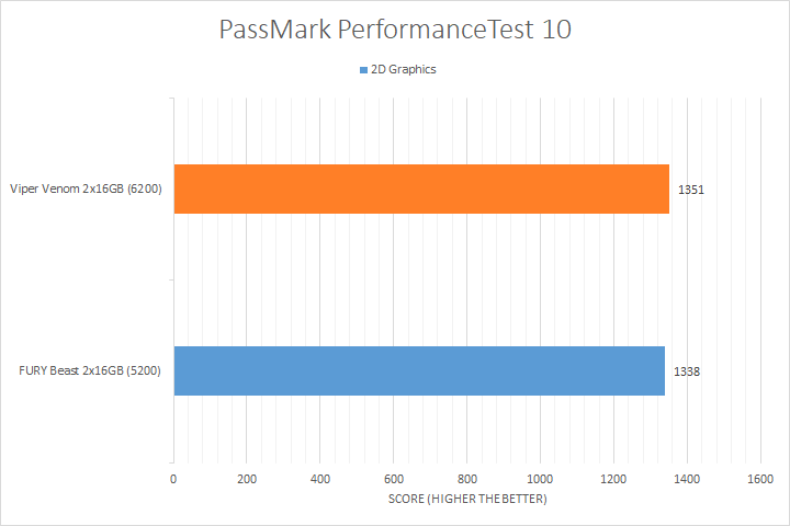 We run PassMark PerformanceTest 10 to evaluate four different areas of our system; coming down to the CPU, RAM, 2D Graphics, and 3D Graphics. It takes a somewhat different approach in obtaining results compared to other programs, which is why we like to use it, haha. PassMark Performance Test 10's memory benchmarking tool is the only test in our setup that takes memory capacity into account, but it does not seem to account for anything above 16GB from our past experience. The memory benchmarking tool did account for the extra bandwidth provided by the Patriot Viper Venom RGB DDR5-6200 2x16GB, as evidenced by its 10% score increase over the Kingston FURY Beast DDR5-5200 2x16GB. Other than that, the rest of the results were almost identical with one other.