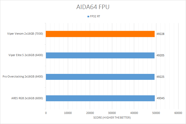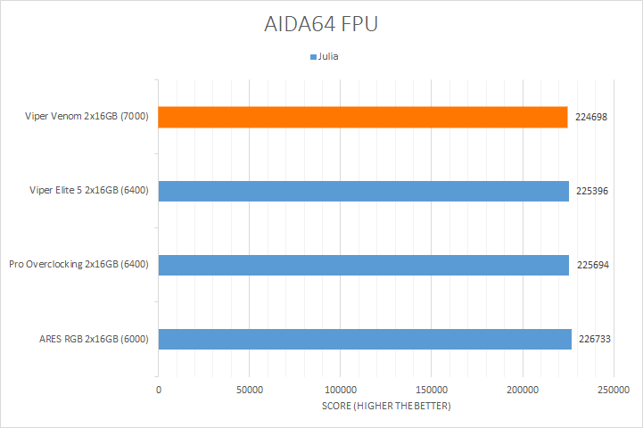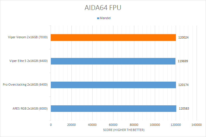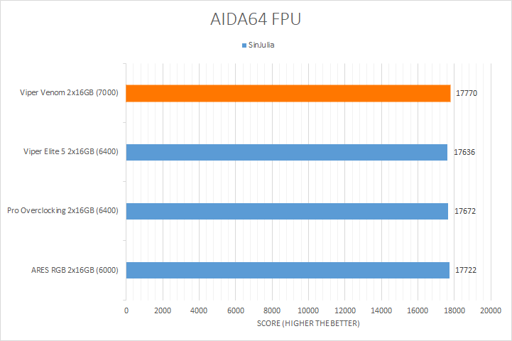 In our second set of AIDA64 tests, the FPU benchmarks, the results typically do not vary much, as they are more influenced by the processor. This trend holds true for all the five tests, where there was little variance observed across all the tested kits. The Patriot Viper Venom RGB DDR5-7000 2x16GB performed similarly to other kits in these tests, placing in the middle of four of the five tests. Overall, the results fell within the expected range for DDR5 memory, with the Patriot Viper Venom RGB modules demonstrating performance consistent with its specifications.