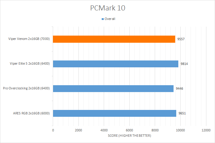 PCMark 10, a popular full system benchmark from UL, provides scores in three categories, including Essentials, Productivity, and Digital Content Creation, along with an overall score. This synthetic test aims to simulate real-world conditions, offering valuable insights into the performance of your system. In our results, the Patriot Viper Venom RGB DDR5-7000 performed in the middle of the pack and produced a third place result out of the four kits evaluated. Breaking down the results into the categories, the Patriot Viper Venom RGB DDR5-7000 2x16GB kit ranked second last in Essentials, second in Productivity, and last in Digital Content Creation.