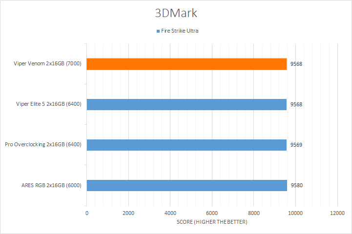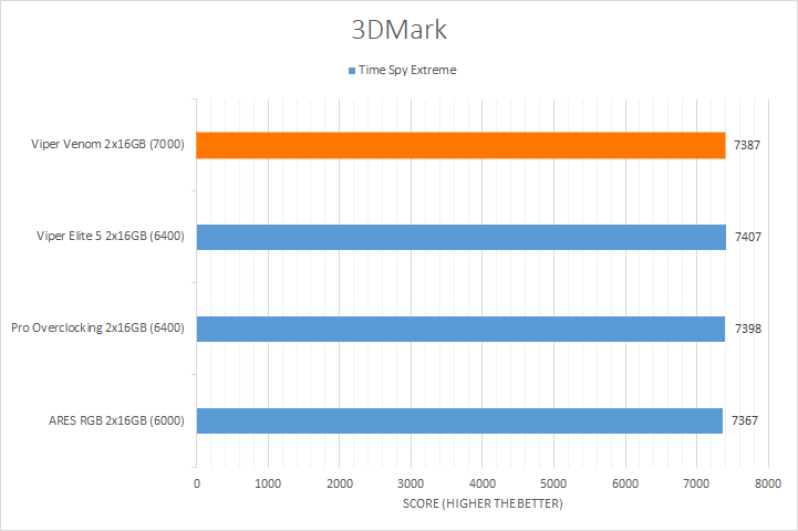 Like UL's PCMark 10, 3DMark is another favorite among enthusiasts and reviewers alike. In fact, it has been part of the APH Networks' battery of standard benchmarks since the very beginning. The latest version of 3DMark offers a variety of presets, including Port Royal for real-time ray tracing, Time Spy Extreme for 4K gaming with DirectX 12, Fire Strike Ultra for 4K gaming with DirectX 11, and Night Raid for DirectX 12 testing on systems with integrated graphics. From the graphs above, it is evident all the kits were close regardless of the memory bandwidth. The largest difference was in the Night Raid test, with a 1% difference from the highest to the lowest score. However, this variance was not surprising, as these tests are more reliant on the GPU used in testing. Our Patriot Viper Venom RGB was competitive in its results, and nothing was out of the ordinary.