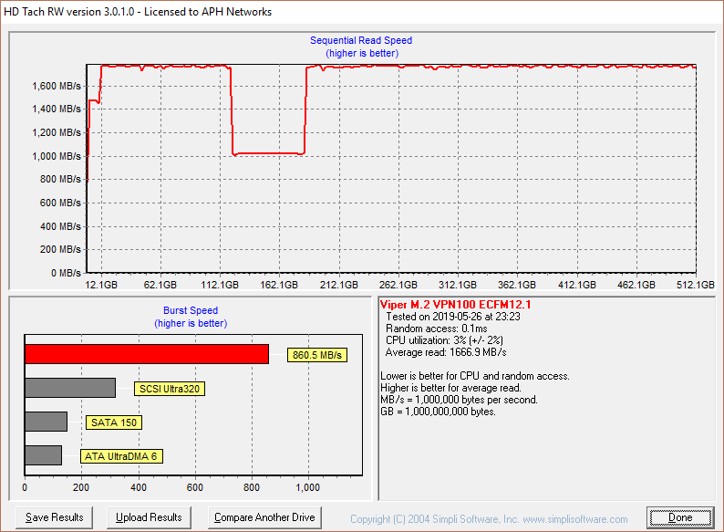 After giving the Patriot Viper VPN100 512GB a clean format and everything is correct, I fired it up for some testing in HD Tach. While HD Tach is more of a drag race than a clear indication of real life performance and has been around for a really long time, it is an excellent storage performance reference among SSDs with the same controller and has been our favorite benchmark long before hard drives even cracked the 50MB/s mark. With an average read speed of 1666.9MB/s according to HD Tach, this score is very impressive and was even faster than the Western Digital Black SN750 NVMe SSD 1TB at 1446.4MB/s. However, it was still a bit off the ADATA XPG SX8200 Pro 512GB's record of 1714.8MB/s. For most NVMe solid state drives, we typically look for something that is faster than 800MB/s. From our experience, most drives do not crack the 400MB/s line. At the end of the day, HD Tach may not be the best test for solid state drives all the time, but these results are always interesting to look at.