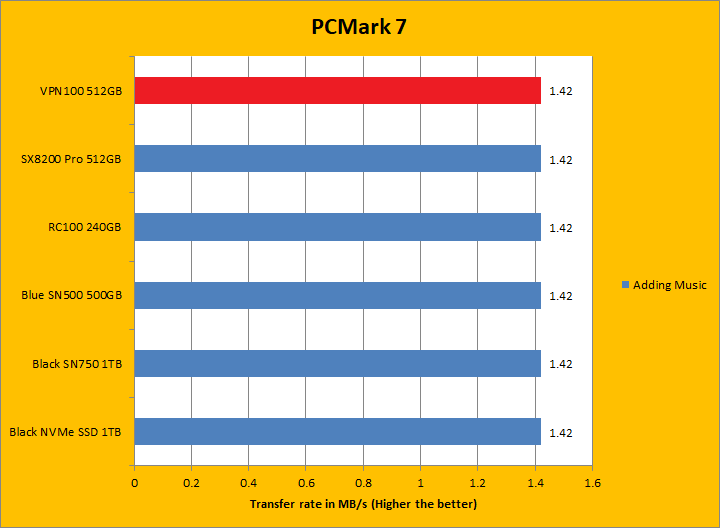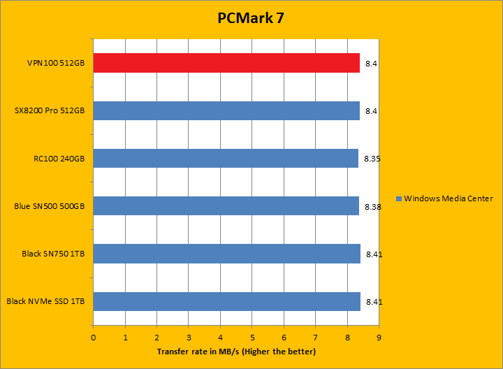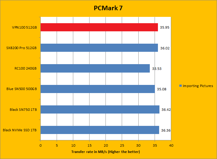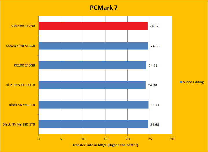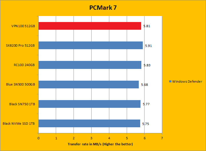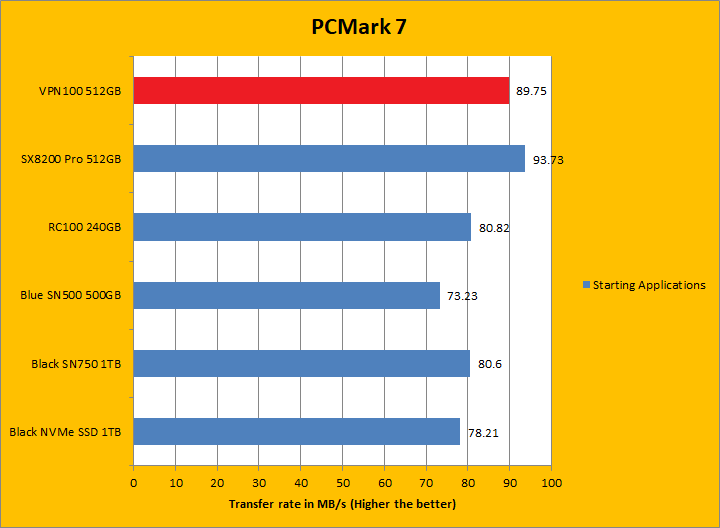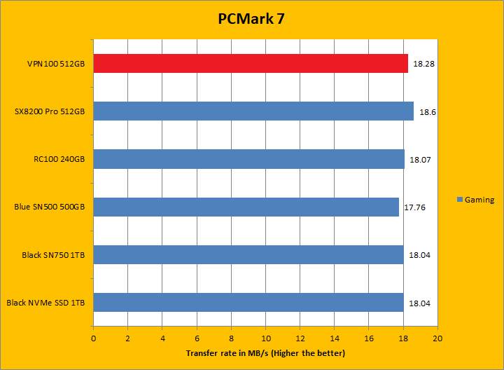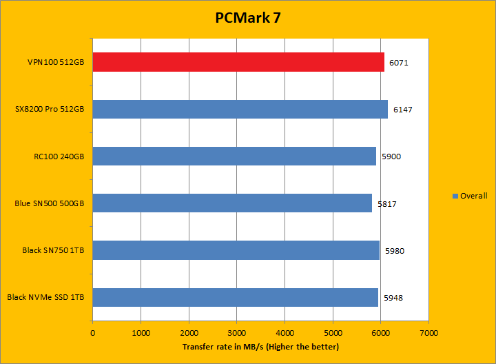 PCMark 7 aims to shed a little more insight into real life performance of your computer hardware by semi-synthetic means -- and all insight is good, right? The great thing about standardized tests is anyone can repeat them and get very similar results, given identical hardware. PCMark 7 is a Windows desktop environment based test, which is exactly what we are after. Well, I am not going to narrate the stuff above in detail, because we all know graphs are there for a very good reason. Just to give you a bit of insight if you are too lazy to go through all eight comparisons, the Patriot Viper VPN100 512GB came in second place; finishing just a hair behind the SX8200 Pro 512GB. In the subcategories, it was slightly edged out by the ADATA drive in all but two tests, but the margins were small. PCMark 7 uses some pretty simple simulations, so it is pretty optimized for drives with relatively fast linear read. The Viper VPN100 512GB's results were excellent.