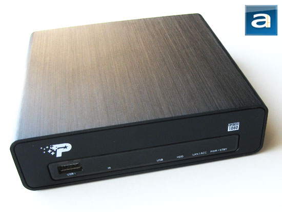 Patriot Box's Office media player is a surprisingly small and stylish device in my opinion, especially considering the amount of features it has. According to my measurements, the Box Office's dimensions are determined to be 14.5cm in width, 3.8cm in height, and 14.0cm in depth. It weighs in at a reasonable 540g. The entire unit is black in color, creating a stealth and subtle look that provides both excellent form and function -- all without occupying too much room, nor does it grab too much attention. The black brushed aluminum casing delivers a clean finish and look that well complements most living rooms, not to mention that it also doubles as a heatsink in dissipating the heat generated by electronic components inside. Its rounded off corners and gapless wraparound shell further reinforces its aesthetics. Meanwhile, the front face is composed of plastic -- again, black in color -- with Patriot's logo near the upper left corner, and a "Full HD 1080" badge on the right. Beneath the two icons is a darkly tinted plastic piece that resides in front of the onboard IR sensor, as well as an array of indicator LEDs labeled USB, HDD, LAN/ACC, and PWR/STBY from left to right, respectively. A front-facing USB port is available for users to plug in their USB mass storage devices; whether it is an external hard disk or USB flash drive, the Patriot Box Office will read and play the compatible media files on it. Otherwise, there are no front LCD displays, nor are there any physical controls on the unit itself. You will need to rely on the included remote control and your television display to use any function on the Patriot Box Office.