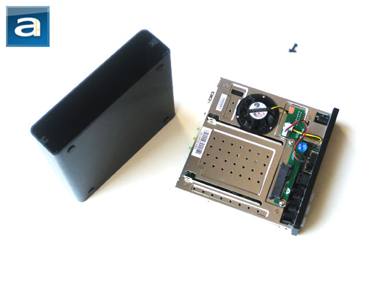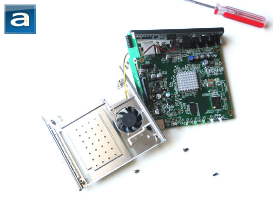 There are two parts to disassembling the Patriot Box Office media player. The main portion consists of removing the internal component tray from the shell, kind of like what you would do with an external hard drive enclosure. This step is very easy and only requires the removal of two screws. From here, you can easily install a 2.5" Serial ATA hard drive, which is why Patriot made it such an easy procedure for the end user. The hard drive tray has ventilation holes at the bottom to reduce heat congestion. Adjacent to the hard drive tray is a fan on the right, and an add-on board that connects to the mainboard for SATA and the power switch, and that supplies power to the fan as aforementioned; it's shown in our photo above. The Power Logic-branded cooling fan as mentioned provides additional cooling for the device to ensure that it runs reliably. Although it is audible within close proximity to the device, it doesn't spin very fast, so it is certainly not a problem as far as noise emissions are concerned in the living room.