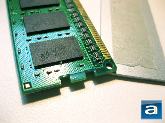 We can see that, while an aluminum headspreader is attached to the memory module on both sides, the memory integrated circuit chips are placed on only one side of the printed circuit board. This design is quite common, as we've seen in a variety of DDR3 RAM sets from manufacturers such as OCZ and Super Talent. The side without the memory ICs has a heatspreader on it mainly to serve a balanced aesthetic purpose.
