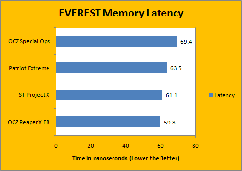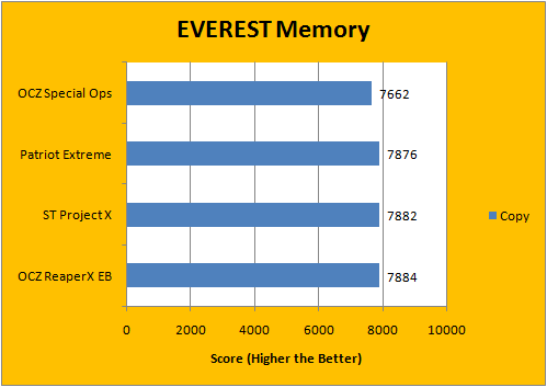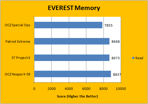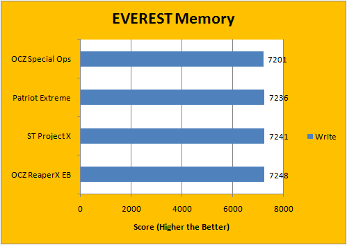 It's kind of interesting how EVEREST generally favors low latency RAM in this revision of EVEREST on the Core 2 platform over ones with high bandwidth. Either way, the Patriot Extreme Performance RAM is extremely close to the Super Talent Project X set (7-7-7-20 and 7-6-6-18, respectively). The OCZ Special Ops Urban Elite RAM fell behind, because of its DDR3-1333 spec at relatively loose latencies of 9-9-9-20. On well, how fair is it to compare value memory (OCZ Special Ops) to the performance units (Everyone else)? Stock Ford Focus vs. Chevrolet Corvette ZR1. Who wins? (The 'vette does. Even if the Focus actually starts up lol. Just kidding.)