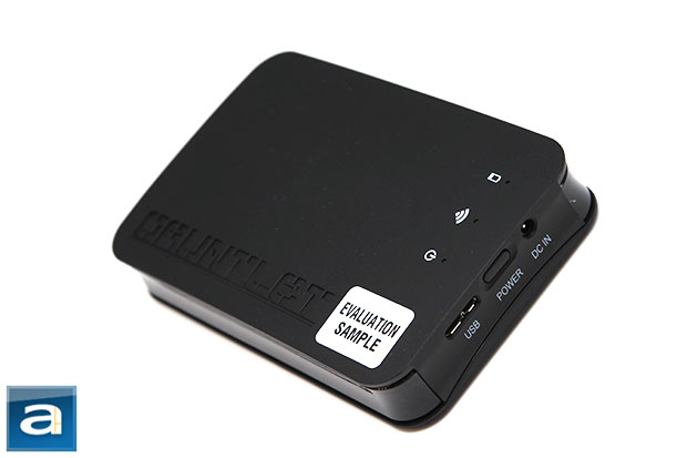 The Patriot Gauntlet 320 is identical in appearance as the Patriot Gauntlet Node, which should not come as a surprise to most people. The only difference between the Node and the 320 is the latter includes a 320GB hard drive out of the box; hence the name. As far as color choices are concerned, what Henry Ford once said about the Model T also applies to the Gauntlet. "You can have it in any color, as long as it is black." (Well, it is not like I am looking for a pink one any time soon, so this is fine with me.) The slick matte finish on the top and bottom is complemented by a glossy matte strip around the outer perimeter of the casing; creating a more interesting look, but at a price of running a little more scratch-happy. Three indicator LEDs at the top are present for the user's convenience. Each are labeled accordingly with small icons; the array begins with a battery indicator, followed by a wireless and power light. The wireless glows white, while the hard drive glows blue. Both will blink on activity. The HDD LED will turn pink when battery is low. For the battery LED, it will switch to red from green when it is done charging.