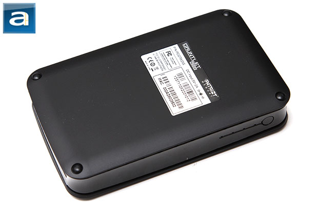 Let's flip the Patriot Gauntlet 320 around as we take a closer look at the product from the opposing 3/4 view. The bottom design is a virtual reciprocal of the top; while not exactly identical, it is shaped accordingly to create a high degree of symmetry. Our photo above shows a standard label nice and center denoting the usual information, such as its regulatory certifications, MAC address, and the ubiquitous "Made in China" line. Good to know. Moving on, four rubber standoffs are placed at the four corners. However, the beveled bottom actually has more depth than the height of the standoffs, making them completely useless in practice. Peeling them off will reveal four screws behind for disassembly, in which we will get to in just a moment. Meanwhile, a strip consisting of four white LEDs is found on the side of the Patriot Gauntlet 320. It will illuminate in correspondence to the current battery charge status when the adjacent button is depressed.