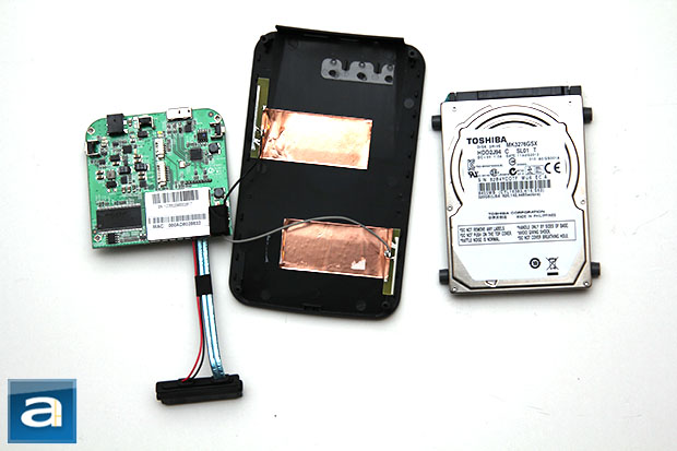 After removing four screws and sliding the cover open, the user will gain access to the inside of the Patriot Gauntlet 320. A closer look reveals a 2.5" Toshiba MK3276GSX 320GB SATA 3Gb/s hard disk drive, specified at 5400RPM with 8MB cache. If you want to examine the PCB in more detail, you will need to remove a few more screws. While you won't void the warranty, I took the liberty to find out more about the important parts. This includes one ESMT M12L2561616A 2MB SDRAM on each side of the board for a total of 4MB RAM. An ASMedia ASM1053 SATA to USB 3.0 bridge interfaces the hard disk drive to the external USB 3.0 connector.