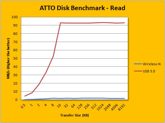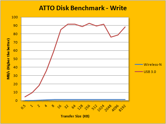 Although the Patriot Gauntlet 320 is essentially an external hard drive with wireless capabilities, its primary purpose is to serve media wirelessly. Therefore, we will not attempt to evaluate every performance attribute of the drive by using a comprehensive benchmark set like an HDD or SSD review. Instead, we will only explore the performance characteristics and limits of the drive or interface using ATTO Disk Benchmark. Using data points collected from the program, a graph is plotted above, comparing its USB 3.0 and Wi-Fi performance. Please do note that Wi-Fi and USB 3.0 cannot be used simultaneously on the Patriot Gauntlet 320.