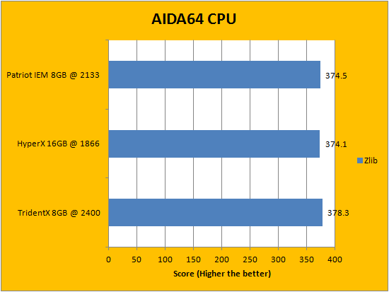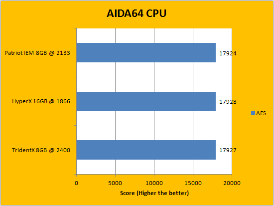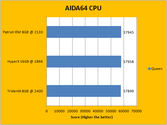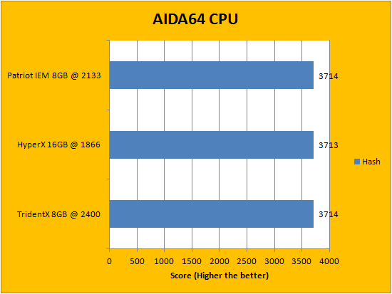As always, our first set of benchmark results presented on the table are data obtained using AIDA64 CPU tests, formerly known as EVEREST. Version 2.70 (The latest release at press time; which can be downloaded from our Downloads page) results cannot be compared with those obtained using 2.60 and earlier, and since we are testing on a completely new platform anyway, might as well go with the latest. It is quite interesting how the products compare, because the slowest RAM has the highest capacity at 16GB, the middle set having the highest latencies, and the fastest kit is only 8GB, as with the guy in the middle. The results are really a toss-up between the three. The Kingston HyperX Predator took the lead in Queen and AES, while the G.Skill TridentX performed the best in Zlib. The Patriot Intel Extreme Masters claimed PhotoWorxx. Although the DDR3-2133 and DDR3-2400 kits were all tied up in Hash, the DDR3-1866 set was only one point behind.