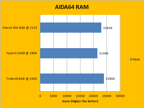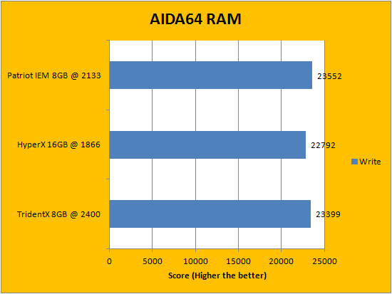 AIDA64's synthetic memory benchmark is the one next up to produce results for our review today. Although the fastest RAM usually scores the highest in these tests, this is not exactly what we are seeing here. Of course, the DDR3-2133 Patriot Intel Extreme Masters and DDR3-2400 G.Skill TridentX took the lead over the DDR3-1866 Kingston HyperX Predator, but it is rather surprising how the pair of supra-2GHz kits actually traded spots consistently, despite the 266MHz frequency difference. G.Skill's TridentX, technically the fastest RAM in our tests today, only took the lead in the read results for bandwidth performance. The Patriot Intel Extreme Masters actually won by a hair in the write and copy tests. As far as memory latencies are concerned, the G.Skill TridentX was by far the lowest; the Kingston HyperX Predator finished in at second place ahead of the Patriot Intel Extreme Masters.