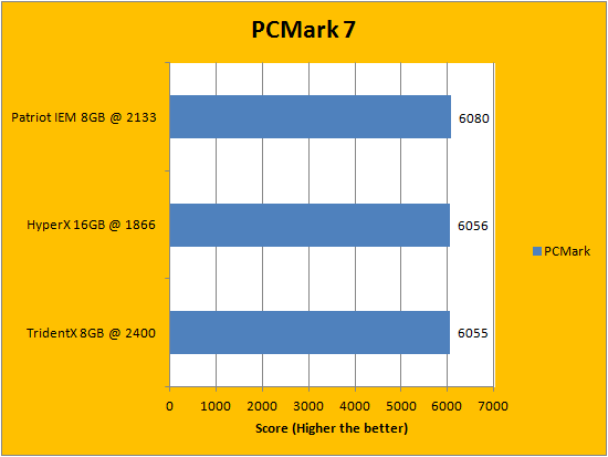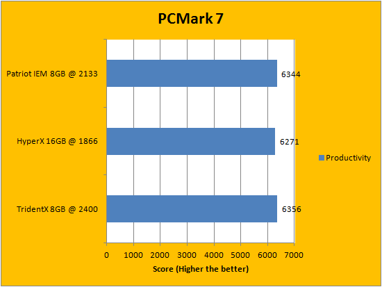 PCMark is a favorite benchmarking program for PC enthusiasts and reviewers alike, because it provides a very easy way to measure performance of different computers. It evaluates a system from seven perspectives (We only included the first six results, since the HDD test is not very relevant to a RAM review), and can be considered a synthetic real life benchmark. In the latest version of PCMark, Futuremark claims they have brought down the variance of each run to ensure accuracy of their benchmarks, and with a relatively low margin of error in mind, all tested RAM came out to be extremely close. If we were to go by absolute values, however, the G.Skill TridentX F3-2400C10D-8GTX 2x4GB and Patriot Intel Extreme Masters PC3-17000 2x4GB both put out a pretty good fight -- with each set claiming a win in three tests each. While the Kingston HyperX Predator KHX18C9T2K2/16X 2x8GB, the dual channel set with the largest capacity but lowest frequency, cannot claim a lead in any of the six criterias, it certainly wasn't far behind at all. I will let you interpret the data in our graphs above.