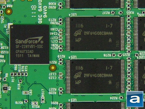 The Patriot Pyro 120GB's shell is attached to the metal backplate by four hex screws at the top. There are two warranty seals over the edge of the housing as shown in our image above, so in order to take a peek inside the SSD, you will have to inevitably void your warranty. Therefore, to save you some trouble, I cracked mine open to take some photos of its internals for you to see. And by doing so, it is unsurprising to find how simple an SSD is inside compared to a traditional HDD -- it makes you almost wonder they cost would an arm and a leg to the end user (Yes, I understand NAND flash chips are still quite costly, haha). It is really nothing complicated -- just a small SandForce reference green printed circuit board, and that's it. Of course, there is more than what that meets the eye. The heart of Patriot's Pyro 120GB is the latest SandForce SF-2281 controller. As the drive controller is fundamentally very important to any SSD, what makes it so special is that it is capable of doing real time data compression to make extremely fast I/O performance possible without the need of external cache memory.