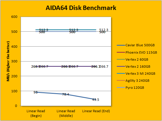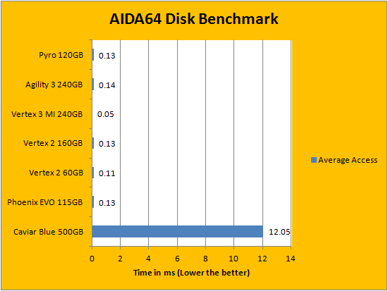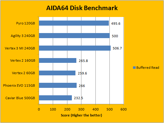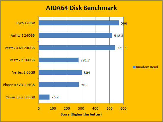 Rearranging the order for our presentation of solid state drive benchmarks in alphabetical order, results obtained from FinalWire's popular AIDA64 benchmarking and diagnostic program is the first set of graphs to make the list. As expected, the Patriot Pyro 120GB performed well within expectations; easily keeping up with the OCZ Agility 3 240GB. As you can see in our graphs above, it hit exactly 500MB/s in the linear read test suite, just like the Agility 3. Meanwhile, it took a lead even ahead of the OCZ Vertex 3 Max IOPS in the Random Read section, but traded spots with the Agility 3 in the Buffered Read category. This set closes off with a random access test, where the Patriot Pyro 120GB ended up right between the two OCZ SF-2281 based drives.