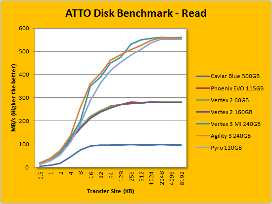 Following up next is our usual ATTO read and write tests. ATTO is an often quoted benchmark because it is easy to use and accurate. For the most part, it is a favorite among reviewers, and I've grown to embrace it as much as the next for the last little while. ATTO uses easily compressible data, so SandForce based SSDs will perform very well here. As manufacturer peak read and write performance ratings are usually done in ATTO as well, whether a drive lives up to its marketing claims or not can be validated by this program. Patriot claims the Pyro 120GB's maximum read is 550MB/s, whereas its maximum write is pinned at 515MB/s. According to our tests, everything seems to be dead on -- however, this does not tell the entire story. While the Patriot Pyro 120GB did live up to its marketing claims at its absolute maximum in our results, its performance is a little slower than the compared 240GB drives. Usually, 240GB drives perform better than 120GB drives, despite the fact they are rated to be identical by the manufacturer.