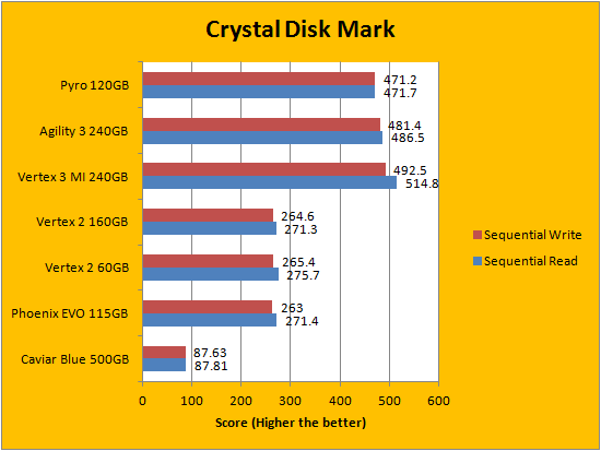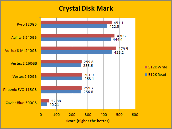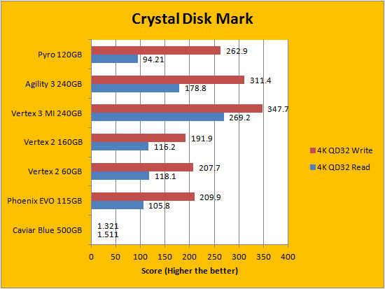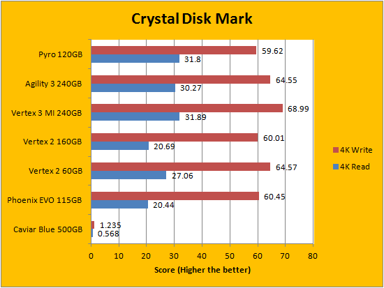 Up next is Crystal Disk Mark 3.0. As our benchmarks progresses on, it seems to me that Crystal Disk Mark favors drives of higher capacity (Or rather, drives with more storage perform better in this program). This is a rather surprising result, so I have rerun the tests quite a few times to ensure the results were accurate. Indeed they were. While the magnitude of difference is not very high in the first three graphs (The Patriot Pyro 120GB is actually slightly ahead of the Agility 3 240GB in 4K Read), the performance gap became is surprisingly large in the numbers corresponding to the 4K QD32 benchmark. It is important to note that I have checked results for the Agility 3 120GB against the Pyro 120GB, and the results were very similar -- so it is not like the Pyro in this review is inherently bad.