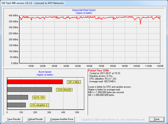 After giving the Patriot Pyro 120GB a clean format and ensuring alignment and everything is correct, I fired it up for some testing in HD Tach. While HD Tach is more of a 'drag race' than a clear indication of real life performance, it is an excellent storage performance reference, and has been our favorite benchmark long before drives even cracked the 50MB/s mark. With an average read speed of 382.5MB/s according to HD Tach, if you look at the graph of OCZ's Agility 3 240GB, we can see the Patriot Pyro is about 5MB ahead of its rival. Compared to SF-1222 SSDs, again we are looking at significant increases over the 230MB/s average mark. If 230MB/s is considered insanely fast, then what the heck is this?