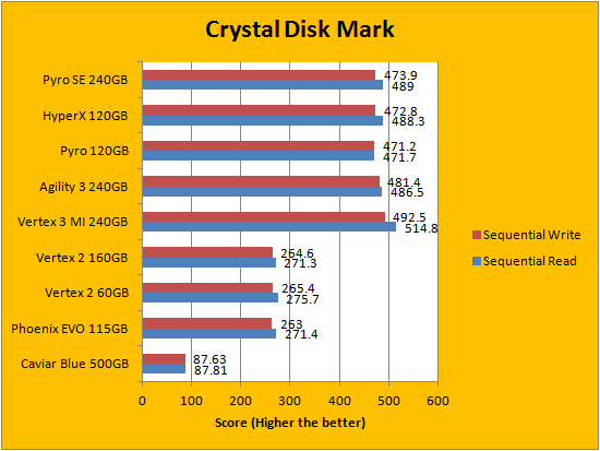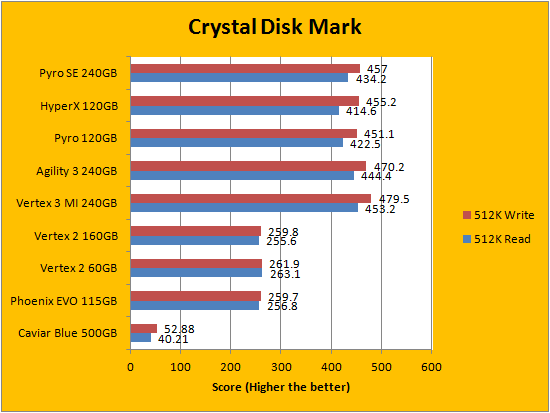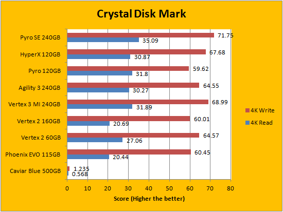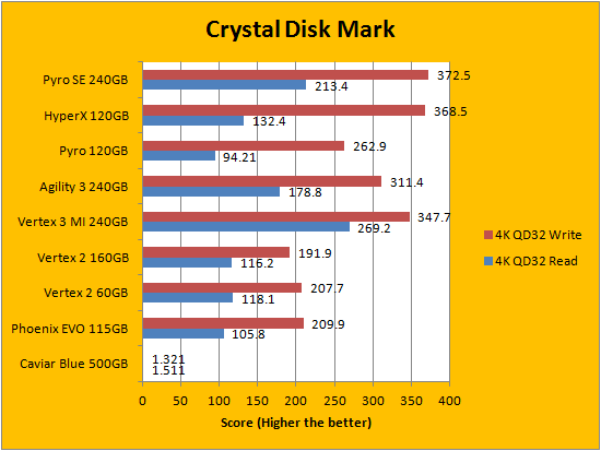 Crystal Disk Mark 3.0 is in the spotlight. Just a bit of background information; higher capacity drives tend to perform a little better in Crystal Disk Mark 3.0. This gives the Pyro SE 240GB a bit of an inherent competitive advantage over the 120GB Pyro non-SE drive we have reviewed in September last year. To see how the Pyro SE 240GB compares against the competition, check out the numbers in relation to the OCZ Vertex 3 Max IOPS 240GB and the OCZ Agility 3 240GB. I am starting to suspect that the performance difference noted in this review between the OCZ drives and Patriot drives is not just on the hardware level (After all, the Pyro SE has essentially identical hardware as the Vertex 3. Therefore, theoretically, it should be consistently ahead of the Agility 3, but slightly behind the Vertex 3 Max IOPS), but also on the firmware level. As you can see in our graphs above, the Patriot Pyro SE 240GB is consistently outperformed by the lower priced OCZ Agility 3 240GB -- albeit by a small amount -- in the first two tests. But when we look at results in the next two tests, the Pyro SE really got its act together, and outperformed even the Vertex 3 Max IOPS, other than in our 4K QD32 read results. In other words, while the Pyro SE did lose by a hair in data throughput, it whooped some serious butt in the amount of IOPS it can pull.