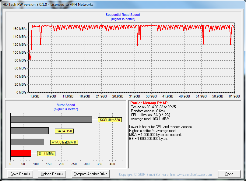 Unlike our previous benchmarks, HD Tach 3.0.1.0 takes a “drag-race” approach to testing storage performance, and it provides some valuable insight in comparing between different drives. From the graph above, you can see we are able to pull an average sequential read of 163.1MB/s; a number much closer to the results from AIDA64. In comparison with our other two Patriot drives, we were able to get 231.8MB/s from the Supersonic Magnum 64GB and 179.0MB/s from the Supersonic Rage XT 32GB. As well, the more recently reviewed Kingston DataTraveler Locker+ G3 32GB was pulling an average read of 136.8MB/s, though that was an encrypted drive. This really is not surprising, considering that the Patriot Stellar 64GB is not built with speed in mind, but rather for mobile purposes. I have said this before, but the fact that they are able to pack decent performance into such a small package is very commendable.