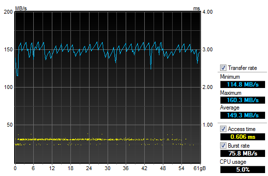 Unfortunately with HD Tune Pro 4.60, there are no fancy independent graph outputs in particular, so as with other USB drives, I took a screenshot and edited it to make it look better for publishing in a review. Much like the HD Tach graph we saw, the line is quite bumpy, but follows a flat trend. In terms of magnitude, the average numbers are different – probably with differing testing algorithms – but the characteristics are similar in practice. Other than this, one thing we should make a final note of is the access time. From AIDA64, we saw an average access time of 0.6ms, which was practically the same as both HD Tach and HD Tune, with differences only coming from the number of included digits. Everything else should be self-explanatory.