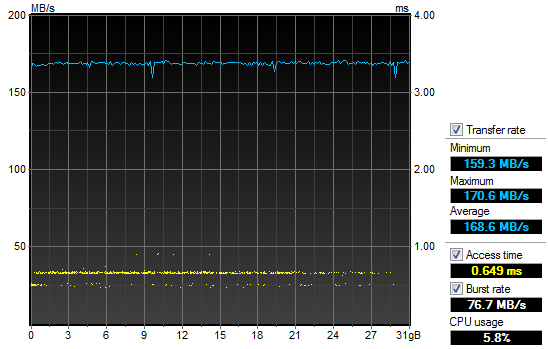 Unfortunately, HDTune does not generate any fancy independent graph outputs in particular, so I had to edit my screenshot out a bit to make it look better for publishing in a review. Again, like our HDTach results on the previous page, the line is nice and flat as before. It differs slightly in magnitude than the other program -- probably due to testing algorithms used -- but its performance characteristics are identical in practice. Other than that, one interesting thing to note is, from the three programs I have used that keeps track of the access time of a drive, they all came out to be around 0.65ms, depending on the level of precision in presents. Everything else should be self-explanatory.