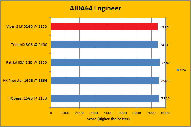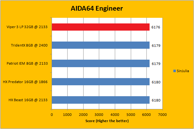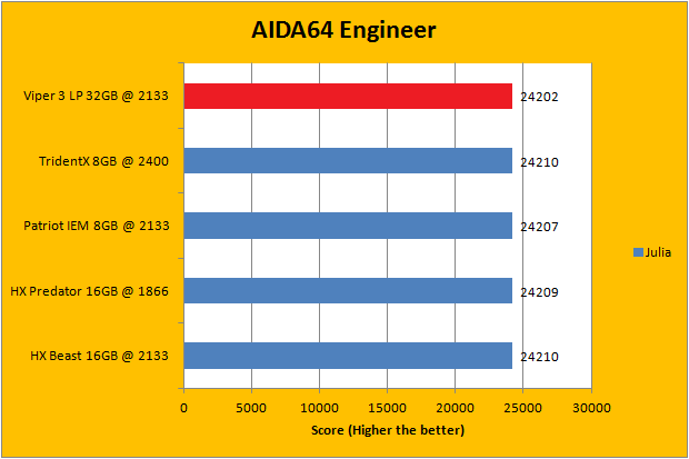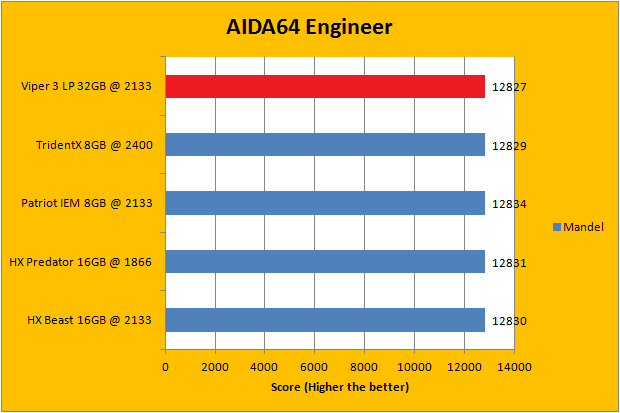 Usually, AIDA64's FPU benchmarks are the least exciting of all when writing a RAM review. This is because the way results are obtained is usually highly dependent on the tested processor; so much to an extent that the outcome is practically irrelevant to the speed or latencies of the installed memory modules. As you can see in our graphs above, all the results are within a fraction of a percent of each other. In the case of Patriot's Viper 3 Low Profile PC3-17000 4x8GB quad channel kit, it generally scored mid-pack for a vast majority of the results; consistently keeping within a hair of the competition across the board.
