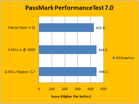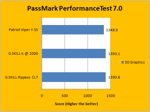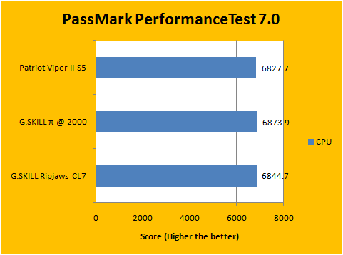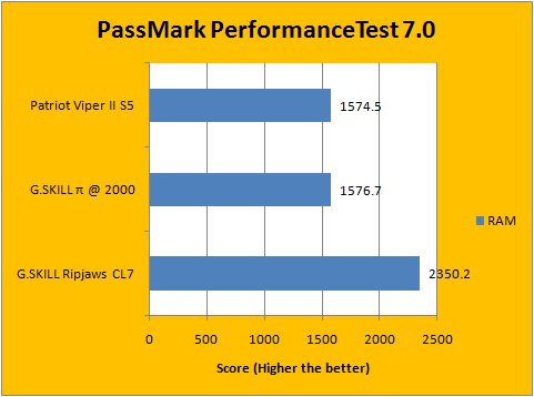 PassMark PerformanceTest is a relatively new benchmarking program to our battery of standard performance evaluation software collection here at APH Networks. It takes a somewhat different approach in obtaining results compared to other programs, which is why we like to use it, haha. From what we see above, all the scores are quite similar -- except under the Memory section. You may be wondering what is the deal with the that. No, it is not a typo -- because PassMark PerformanceTest actually takes into account memory capacity, the 8GB G.SKILL Ripjaws set had a huge advantage over the compared 4GB kits like the Viper II Sector 5s on the board. Between the G.SKILL Pi series and Patriot Viper II Sector 5, the difference in score is quite negligible.