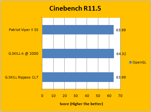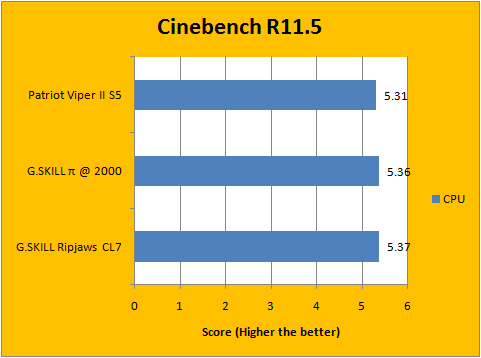 Our run of Cinebench R11.5 proved to be quite interesting. While one may think rendering performance will benefit from high bandwidth memory running on a high divider, our CPU based test actually preferred lower latency RAM. The G.SKILL Ripjaws scored 5.37 points, while the Pi series came in very close with a score of 5.36 running at 7-10-10-28 1T. Our Patriot Viper II Sector 5, with higher latencies compared to the Ripjaws, still scored a relatively decent 5.31. Meanwhile, OpenGL rendering appeared to be latency invariant -- both the Patriot and G.SKILL DDR3-1600 RAM posted identical results.