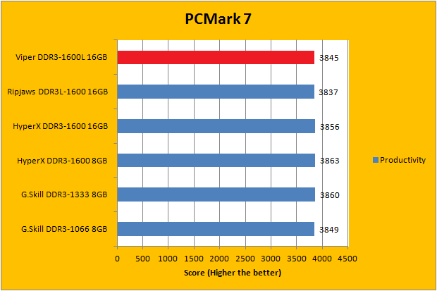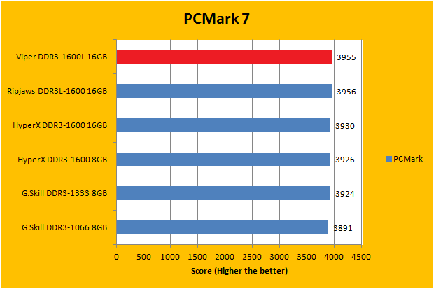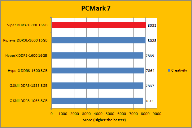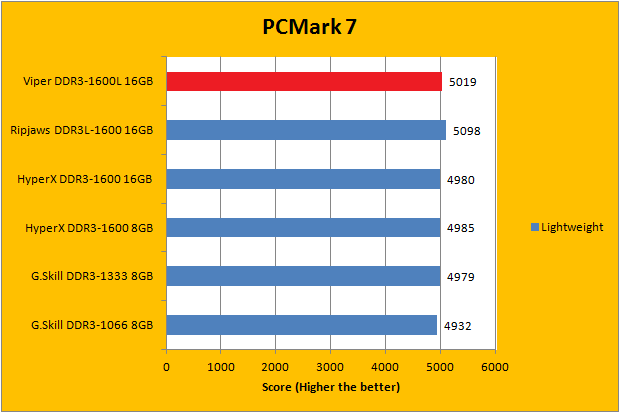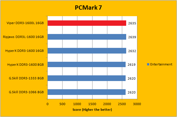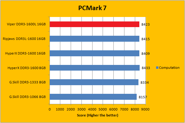 PCMark is a favorite benchmarking program for PC enthusiasts and reviewers alike, because it provides a very easy way to measure performance of different computers. It evaluates a system from seven perspectives (We only included the first six results, since the HDD test is not very relevant to a RAM review), and can be considered a synthetic real life benchmark. In the latest version of PCMark, Futuremark claims they have brought down the variance of each run to ensure accuracy of their benchmarks, and with a relatively low margin of error in mind, all tested RAM came out to be extremely close. There is no consistent lead with a large margin noticed for any of the products used for comparison in this review. The Patriot Viper SODIMM PC3-12800 2x8GB took its share of wins (Noted in the overall score), but as we can see with other benchmark results in this review, it did not sweep the table.