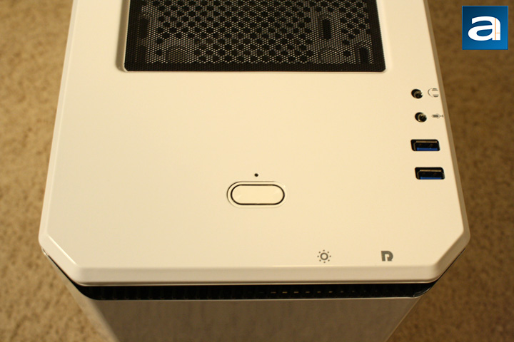 The front panel connectors are not exactly on the front panel, but on top of the Phanteks Eclipse P400 -- although there are still two buttons kind of tucked away on the front panel. Starting from the top far right are the two 3.5mm audio jacks for microphone in and headphone out. They are labeled to easily identify this. Unfortunately, the top panel overlaps a bit with my audio jacks, and I could not use them properly, since it would make a strange noise in my headphones if I plugged them in there. My guess is this is probably a pre-production manufacturing problem, since we got some of the very first batches. Right below them are two USB 3.0 ports, which are not labeled, but can be easily identified with the blue inside. In the center is a big oval shaped power button, and right above it is an HDD activity LED. These are also not labeled either, but it should be obvious once in action. At the end of the top panel, you can see the arrow pointing in circle, which corresponds to the reset switch adjacent to it. On the left of it is the included LED controller. If you have the S version, the fan controller will also be found in the same location. I really enjoyed the placement of these buttons, because it prevents you from accidentally pressing them.