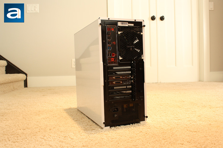 Like a conventional mid-tower, the back panel has a rear vent exhaust, motherboard I/O, and seven expansion slots. The back panel is black, which is a nice contrast to the rest of the case. A nice feature next to the expansion slots is the locking mechanism, where you first have to remove two thumbscrews before you are able to easily change any of the expansion slot devices. The rear exhaust fan is for 120mm fans only, but you can adjust the fan to be either higher or lower. I have some trouble with keeping my motherboard I/O shield in place. The I/O shield will not completely click into place, and will fall out occasionally with no motherboard installed. However, after installing the motherboard, it was secured. At the bottom, we find the power supply bay. A lot cases nowadays have vents next to the expansion slots, but the Phanteks Eclipse P400 does not, which is good in my opinion, since it allows for less dust to enter. The side panels are held in place by two thumbscrews each, and they are captive thumbscrews so they will not fall out, but you can still completely remove them if you want.
