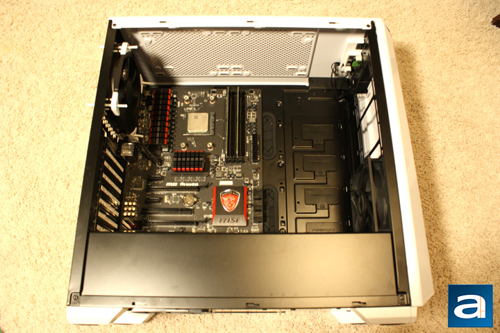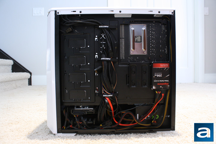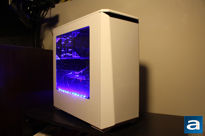 Here is the completed build. Due to the white balance of my camera, the BitFenix Alchemy Connect LED Strips I installed in my computer are blue, but this picture makes it look like it is purple. I am very satisfied with the final look, and the open design of the interior ensures good airflow and a clean final appearance.