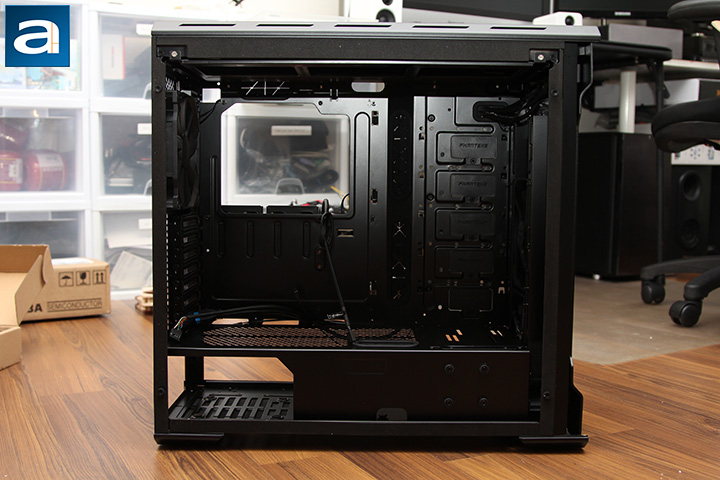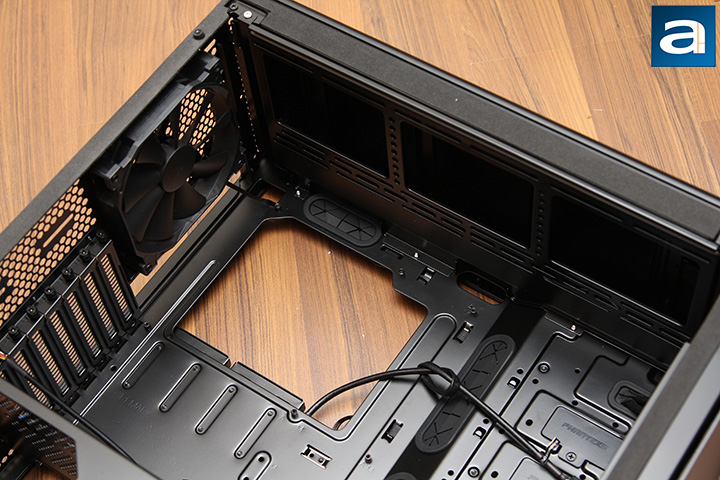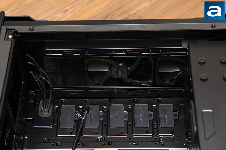 Starting near the back, we see the 140mm Phanteks PH-F140SP fan in black. For your information, this fan is rated at running up to 1200rpm, with a maximum airflow of 82.1 CFM, and static pressure of 1.33 mmH2O. Just to note, this fan is a three-pin voltage controlled fan, but as you will see soon enough, this fan can connect to your four-pin motherboard header with a built-in fan hub. The motherboard back opening is also present here, and should be large enough to work with cooler back plates. The tallest cooler this case can accommodate is 194mm. Finally, at the top there is spacing for top-mounted fans. Rather than attaching the fan directly to the inside, there is a frame that slides out to allow users to attach up to two 140mm fans or three 120mm fans. In terms of liquid cooling, the top bracket can also support up to a 360mm radiator.