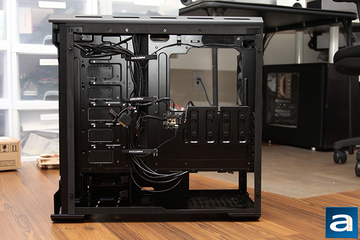 The last place we can look at the Phanteks Enthoo EVOLV ATX Tempered Glass Edition is the back. Here, you can see the numerous cabling holes to give users the ultimate flexibility in wiring up their rig. Three Phanteks labeled Velcro straps are also here, and it really makes cabling a clean experience, which you will see on the next page. If you are OCD, Phanteks' logo on the Velcro strap is upside-down, and it is not reversible, which does not make sense in my opinion. The real party piece found on the back is actually in the middle, and this is the integrated PWM fan hub. It is capable of powering and controlling up to seven different fans. You can either connect the hub to a PWM fan header on your motherboard, or to your power supply directly via an included power SATA connection. Otherwise, I should note Phanteks has given ample spacing for cables to run near the back. With almost 20mm at its narrowest area and up to 30mm at its widest gap, the Phanteks Enthoo EVOLV ATX Tempered Glass Edition is very easy to cable manage. I wish there were a few more cable tie down points, but it is not a huge deal. Otherwise, both externally and internally, the Phanteks is a treat, and it really is a top-tiered product. But the rubber only hits the road when we actually use Enthoo EVOLV ATX Tempered Glass Edition, so let us move to the installation process.