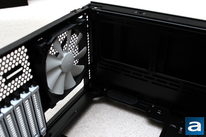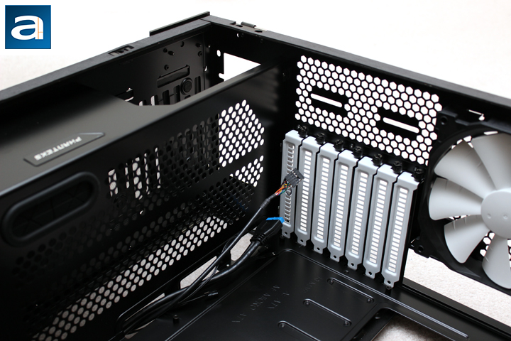 Starting near the back, we see the 140mm Phanteks PH-F140SP fan in white. For your information, this fan is rated at running up to 1200rpm, with a maximum airflow of 82.1 CFM, and static pressure of 1.33 mmH2O. Just to note, this fan is a three-pin voltage controlled fan, but as you will see soon enough, this fan can connect to your four-pin motherboard header with a built-in fan hub. The motherboard back opening is also present here, and should be large enough to work with cooler back plates. Finally, at the top there is spacing for top-mounted fans. Rather than attaching the fan directly to the inside, there is a frame that slides out to allow users to attach up to two 140mm fans or three 120mm fans. In terms of liquid cooling, the top bracket can also support up to a 360mm radiator.