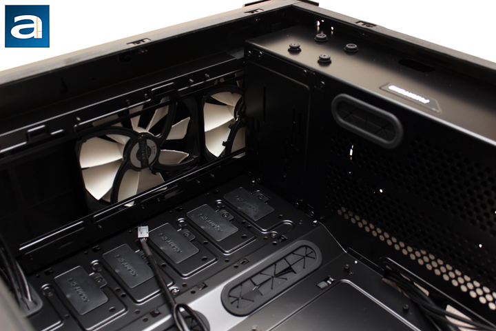 At the front of the inside of the Phanteks Enthoo EVOLV ATX are a few more things to point out. For one, you can see one of the cabling areas, which is lined with rubber to hide extraneous cables. Two more of the 140mm Phanteks fans are visible here. You might be wondering where the drive bays are, and in response I will say you are actually looking at it. Each of the Phanteks-labeled plates are removable to create an opening where the drive can sit. The included drive caddies slide into place, and they are capable of holding a 3.5" or 2.5" storage drive. In addition to the five different mounting positions, there are three 2.5" drive slots, with one near the side-facing Phanteks logo, and two behind the motherboard. Then there is a drive cage in the separated chamber located at the front. As you can tell, this area is very flexible in accommodating different drive options. In addition, this area can be reconfigured for water cooling options. For example, the drive cage underneath the separator can be removed, and a reservoir or pump can be installed in this area. In addition, Phanteks includes a small mounting plate for users to mount their custom loop water cooling components. It is great to see manufacturers encouraging this type of modularity, but unfortunately it is also quite rarely found on other chassis.