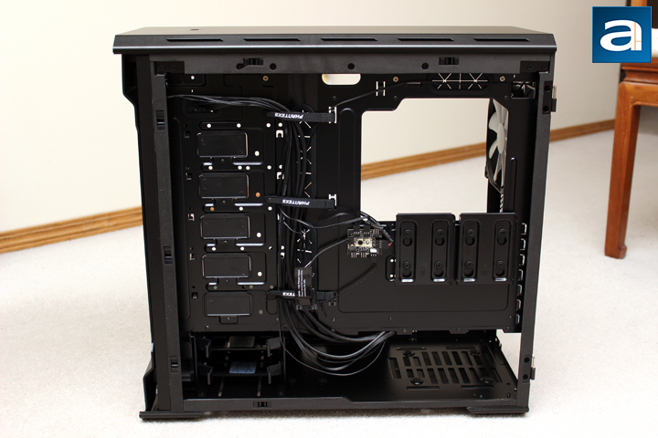 The interior of the Enthoo EVOLV ATX is similar to a recent case we reviewed, the Fractal Design Define S, as there is no dedicated drive bay in front of the motherboard. Unlike the Define S, however, there are actually two areas to the case. One is the main chamber you see, where the motherboard sits. The other is underneath for the power supply and a removable two-slot drive bay. E-ATX motherboards up to 264mm wide are supported in addition to ATX, micro ATX, and mini ITX form factors. Mounting risers are labeled “A” or “M” depending on the size of the motherboard you wish to install, but pre-installed mounts are placed for the standard ATX size.