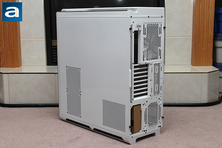 Turning out attention to the other side, the back panel features ventilation for a radiator and a power supply. For those people who like top-of-the-line computers, this is one of many options for you to install such components. As you will see later in this review, a radiator can also be mounted at the top, bottom, top rear, or front in addition to the back; where the latter can see from the photo above. The same idea goes for the power supply, but the only available slots are the positions you see here, which is behind the motherboard tray or in front of it. The one in front of the motherboard tray is currently covered by a ventilation plate. As a disclaimer, you can technically install two power supplies if you wanted to push your system to over nine thousand. As per the other standard openings, you will have access to the motherboard I/O opening and eight expansion slots. The rear exhaust is able to house a 140mm or a 120mm fan, but a 140mm fan is already included for you. Below the 140mm fan next to the expansion slots are more openings. It seems like you have the option to install additional hardware here, but according to the manual from Phanteks, these are simply openings for ventilation.