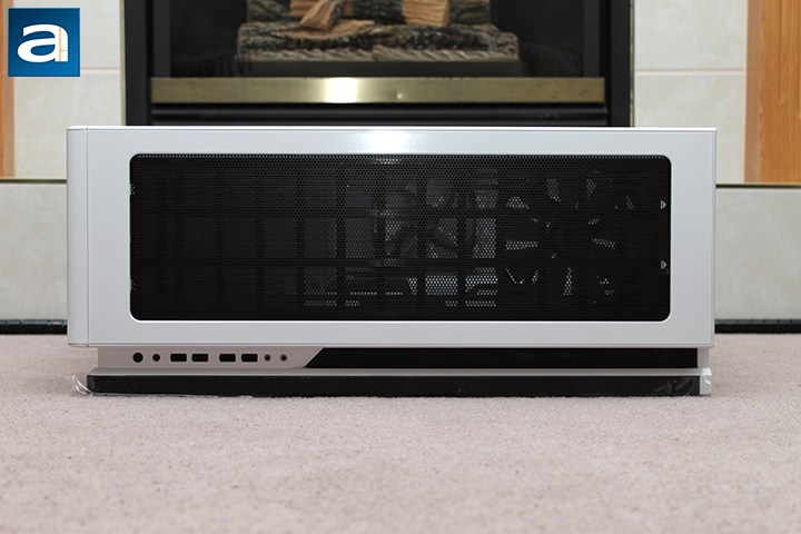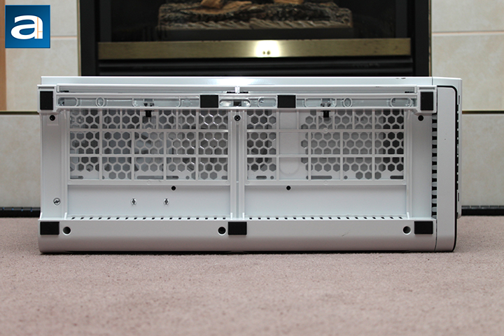 Right off the bat, you will be greeted with a very large removable dust filter on the top panel. Underneath, you will have the option to install three 140mm or four 120mm fans in addition to a radiator of your choice. Because there is so much room, you have the option of installing a radiator of any size, given it fits under the hood. Next to it, you will find your standard front panel I/O and other buttons. In chronological order, the standard 3.5" audio jacks, USB 2.0, USB 3.0, and reset button are available. In addition, a LED on/off switch is featured here, too. To add to the visual appeal, a long strip stretches on the edge of the case and wraps around to the front panel with a power button. When powered on, a long white LED strip activates, adding to the classy look and feel of the case.