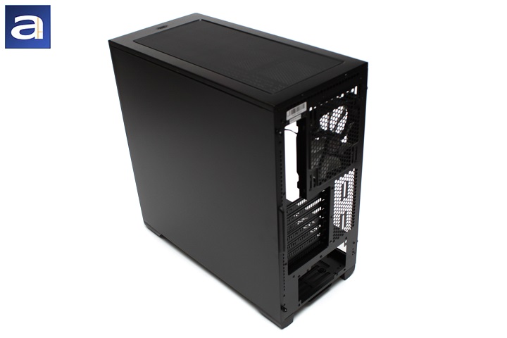 Turning our attention to the back, we can see a standard layout for most mid-tower of this range. From top down, we have the standard rear 140mm exhaust next to the I/O opening for the motherboard. If need be, the 140mm fan can be swapped out for a 120mm fan. Moving downwards, we have seven expansion slots, extra ventilation holes, and the opening for the power supply. Thumbscrews can be seen holding in the back panel.