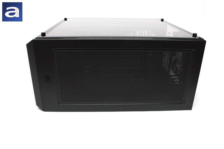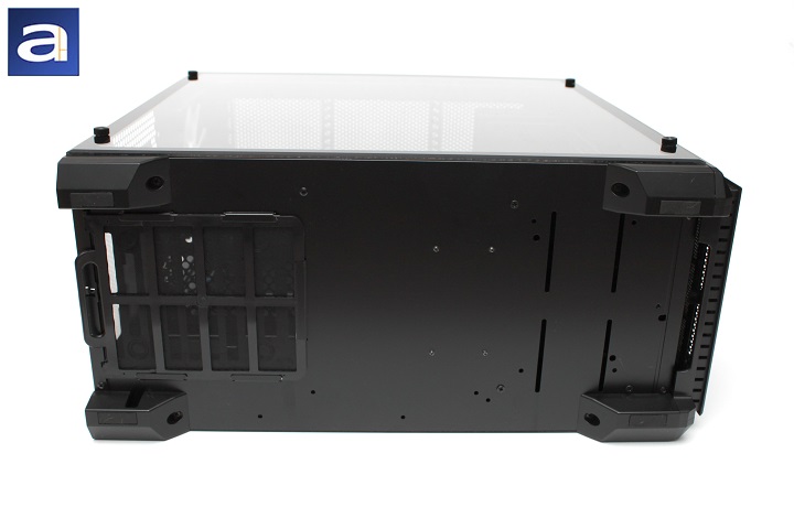 The bottom does not feature anything out of the ordinary, either. You will find a removable dust filter covering the ventilation for the power supply, and four rubberized plastic feet to allow cool air to flow from the bottom while dampening any vibrations. The feet provide approximately 1 cm rise over the surface it resides on. If you plan on removing the bottom mounted hard drive cage on the inside, this would be the area to access the screws that are holding it down. Additionally, there is a hole near the front for ventilation, and also serves as a place to easily pull the front panel off for any reason.