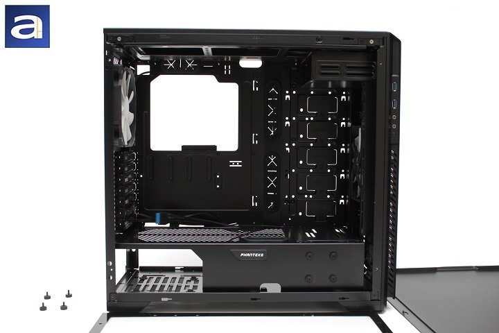 From this angle, we can see a 140mm Phanteks PH-F140SP fan rated at 1200rpm with a maximum airflow of 82.1 CFM, static pressure of 1.33mmH2O, and 19dB acoustical noise controlled via a 3-pin header. The motherboard back opening is found here, and should be large enough to accommodate most aftermarket cooler backplates. Finally, as mentioned on the previous page, the bracket in which you mount your radiator or fans of your choice can be removed via the metal colored Philips-head screws. This can accommodate a radiator up to 360mm, but the 5.25" drive bay must be removed in order to accommodate that particular size.