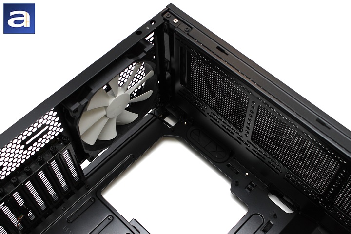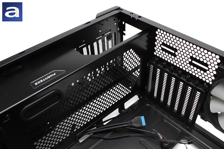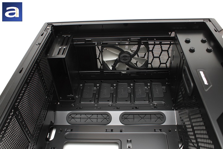 Standard features can be seen from this angle, including the expansion slots and a mounting slot for a custom-loop liquid cooler reservoir. The divider between the power supply and the rest of the case can also be found here for hiding all the extra cables. This area is also well ventilated with honeycomb holes. Three routing holes can be found here for cabling. Additionally, there are four rubber feet in the power supply area for the PSU to rest upon, and helps with vibration dampening. As aforementioned, the feet give a 1 cm clearance, giving the PSU plenty of space for intake air. As for the rubber risers, it will give an extra few millimeters between the PSU and the bottom of the case. Additionally, you may decide to mount your 2.5" drive tray on the front side of this divider. With the large acrylic window, this gives the end user all the excuse in the world to show off your SSD in addition to any hardware you wish to pack into your system. A plate used to support extra accessories is also found near the front of the divider, which can be removed for additional modularity and customization.